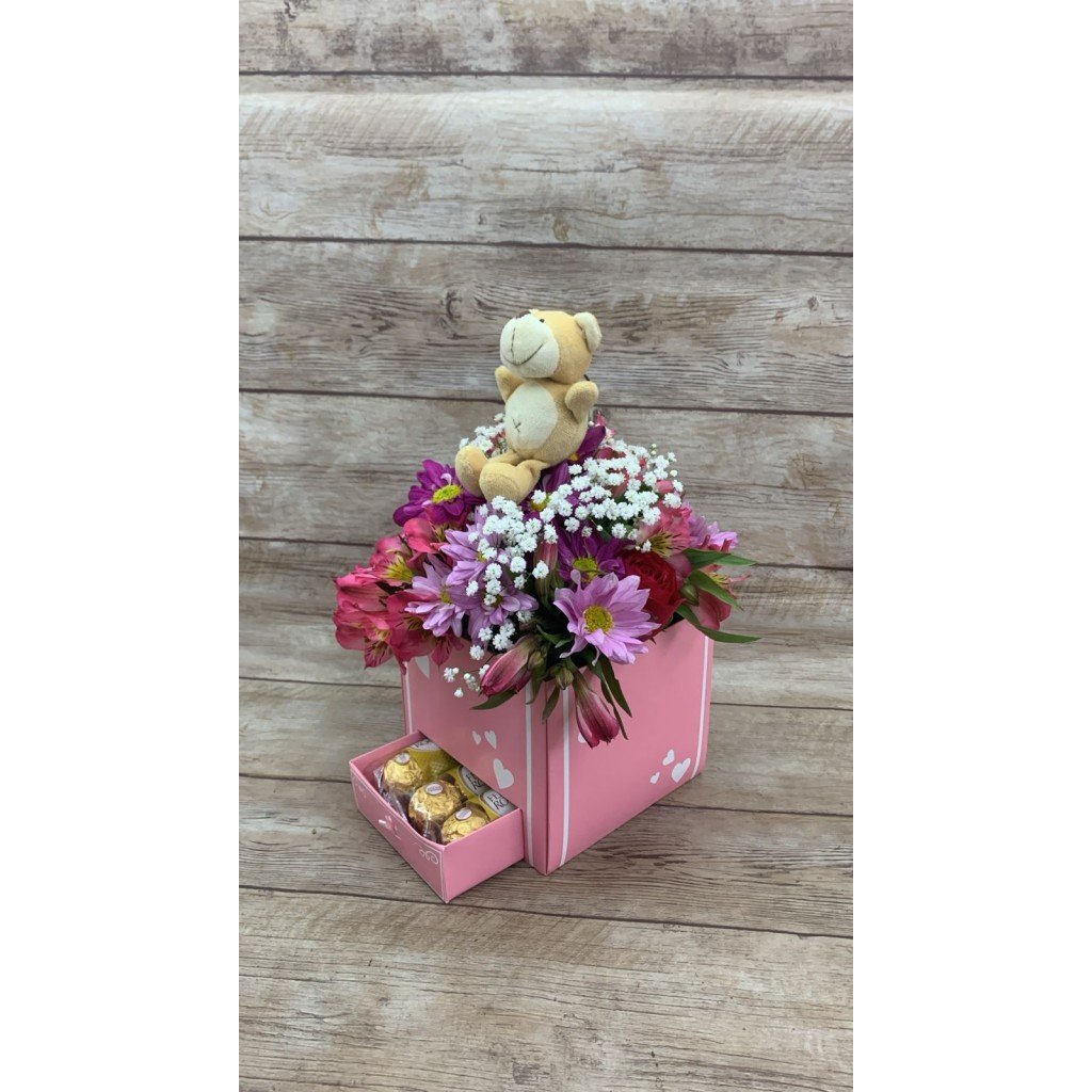 Lindo Buquê no Porta treco de Papelão no Floral com 5 astromélias + Flores do campo + um chaveiro de pelúcia + 9 bombons Ferrero Rocher