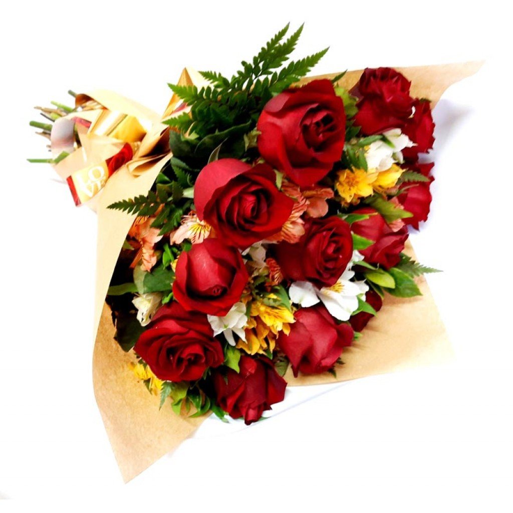 Lindo Buquê com 12 Rosas Vermelhas + Astromélias Coloridas, com folhagens verdes, envolvidos em um lindo arranjo no papel kraft.