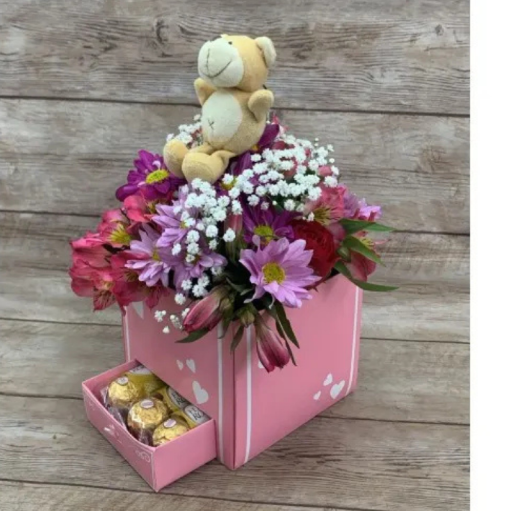 Lindo Buquê no Porta treco de Papelão no Floral com 5 astromélias + Flores do campo + um chaveiro de pelúcia + 9 bombons Ferrero Rocher