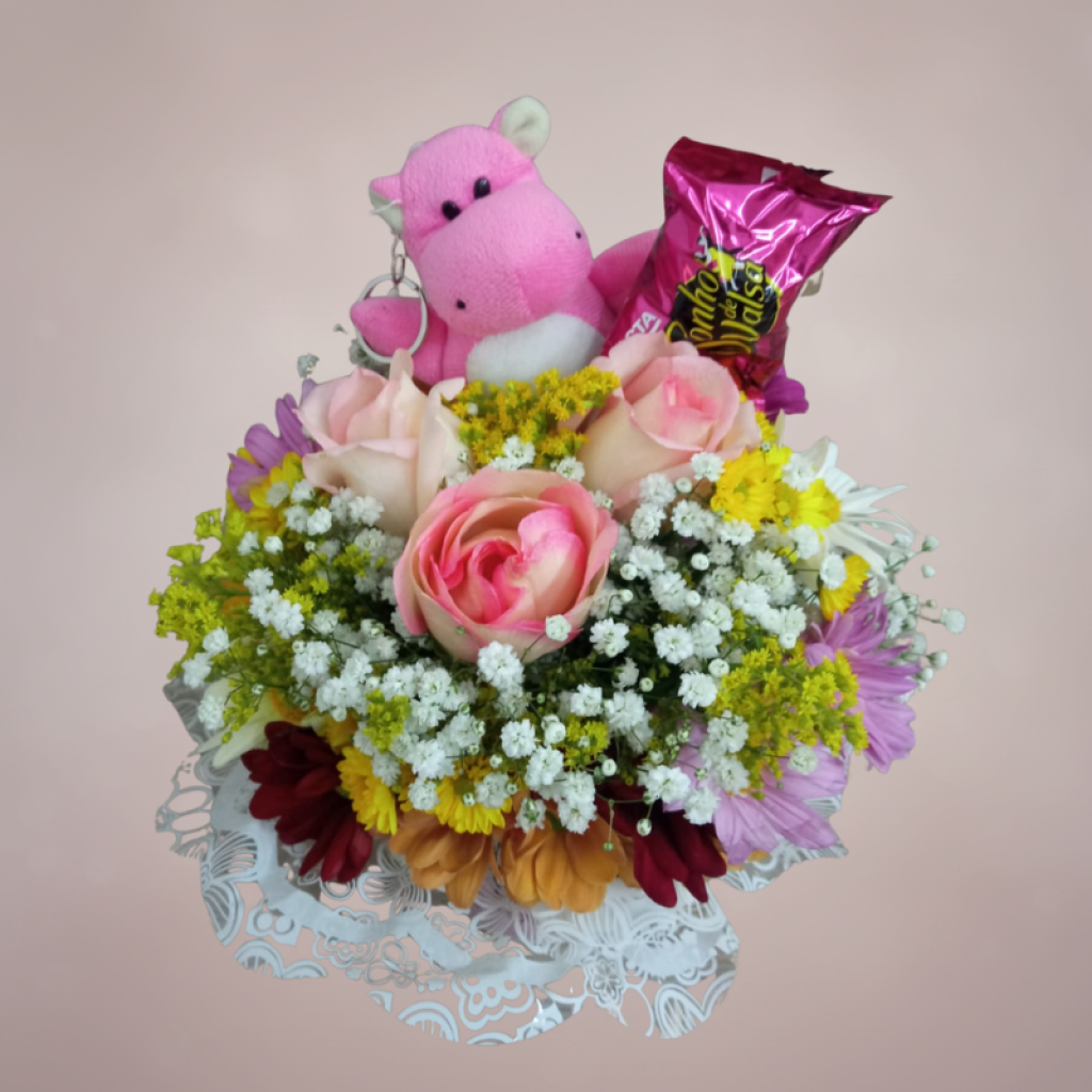 O arranjo acompanha chaveiro de pelúcia e um chocolate, tornando o presente ainda mais especial e carinhoso. Ideal para presentear em aniversários, datas comemorativas, agradecimentos ou para surpreender alguém querido e iluminar o dia com cor, afeto e doçura.