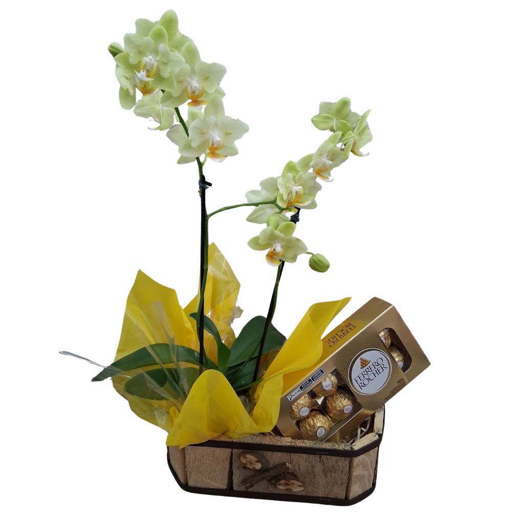 Mini Orquídea Phalaeonopsis pote 9 (aproximadamente 40cm) com 2 Hastes, decorada no cachepô de madeira, com 1 cx. de Ferrero Rocher com 8 un.