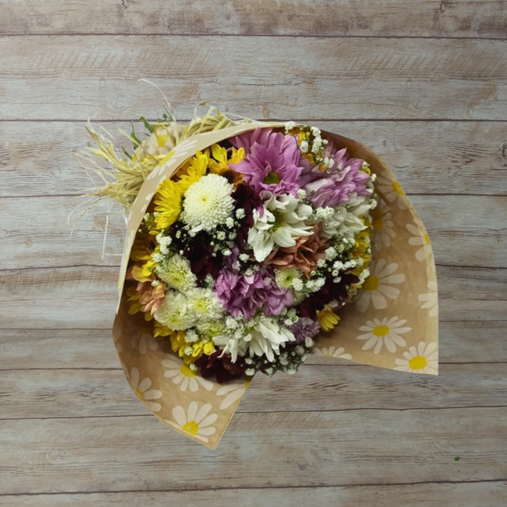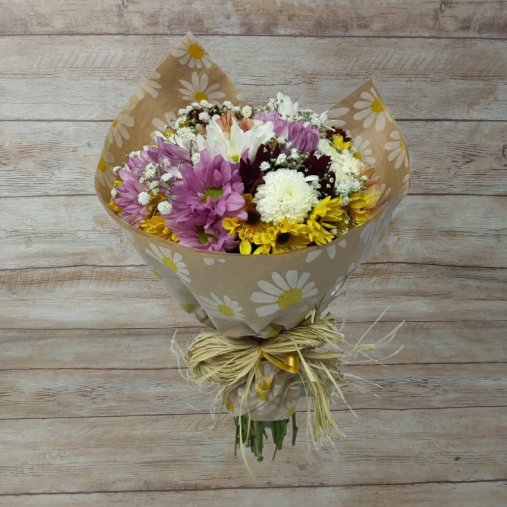 Lindo Buquê Colorido, com flores do campo e Gipsofilas. Com embalagem de kraft com o tema de margaridas, e laço de rafia.