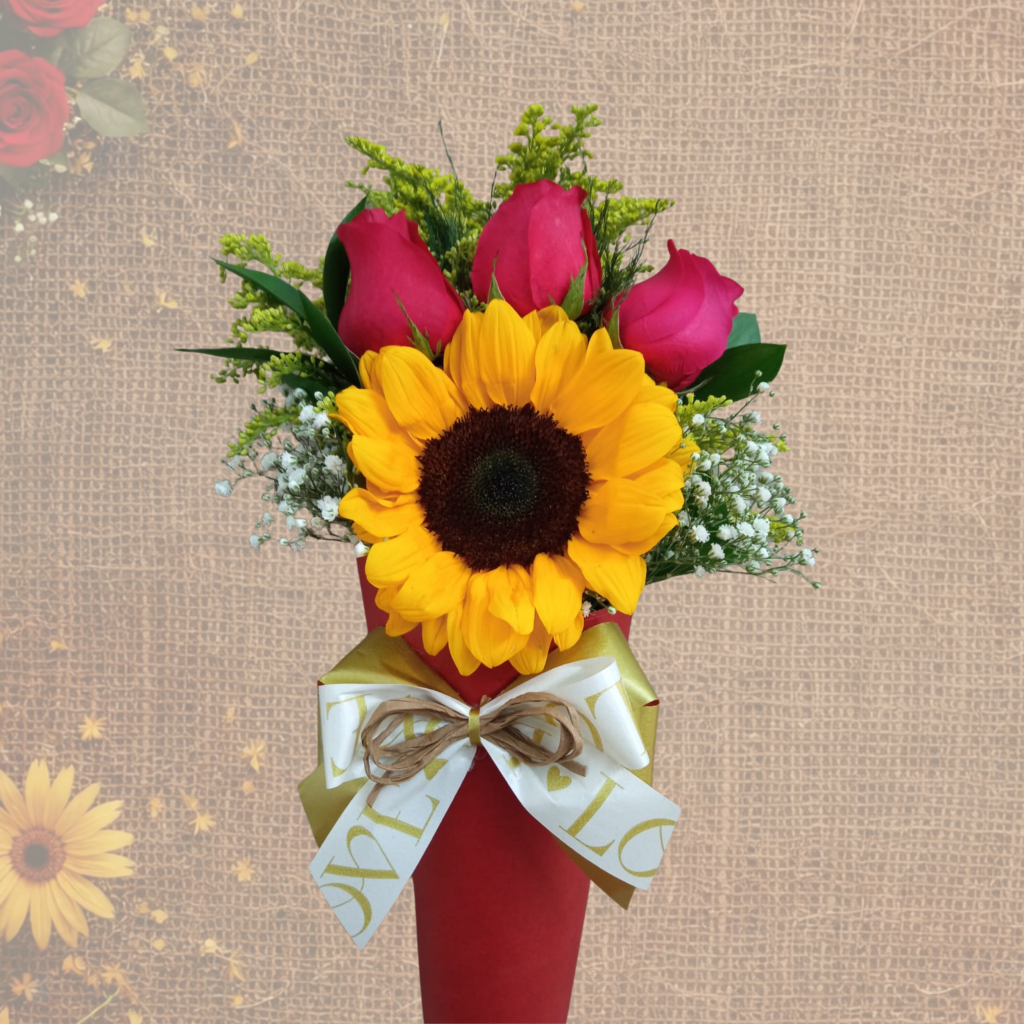 Lindo Arranjo com 1 Girassol + 3 Rosas vermelhas + Folhagens no Cone de Papelão